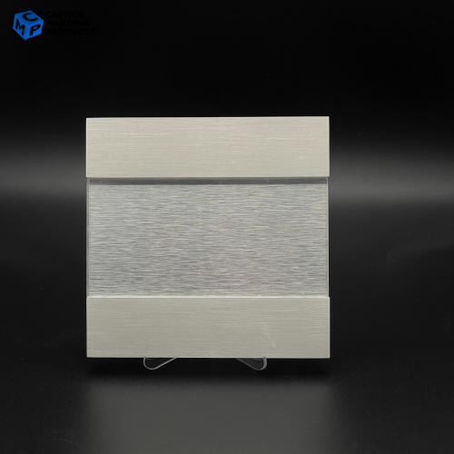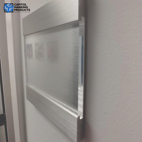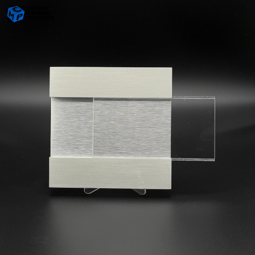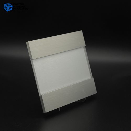 - Materials: Brushed Aluminum header & footer bars with clear acrylic sliding window